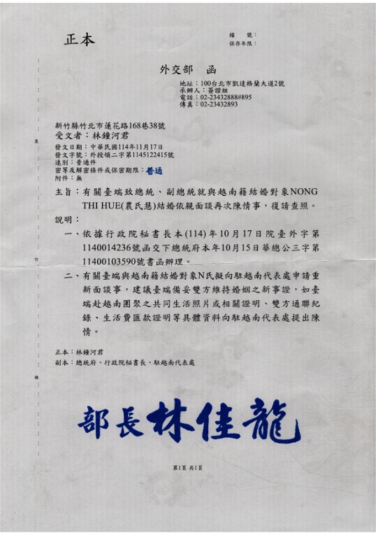 第三次面談改駁回後再次向總統府陳情,外交部回函.